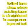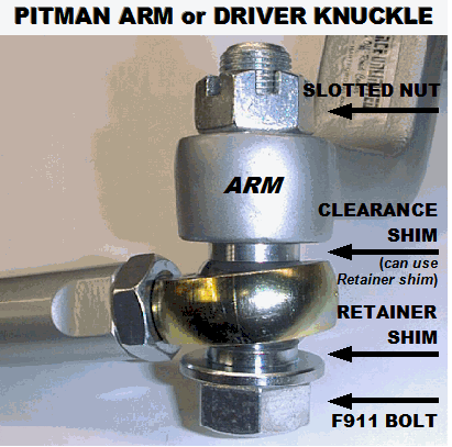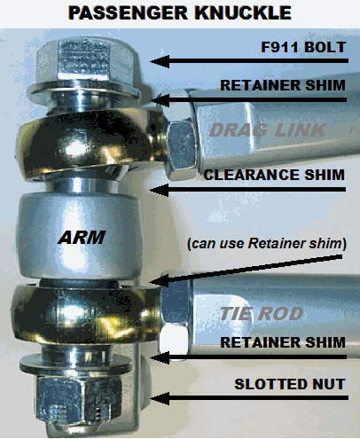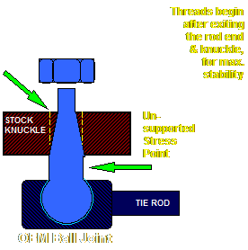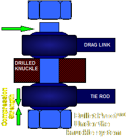 3. You next need to drill out the taper in the knuckle and pitman arm to accept the new, much stronger straight non-tapered bolt included in the kit. Forged steel knuckles are not hard material, but dense. A good sharp 3/4" drill bit should take no less than a few minutes per hole to drill. You can easily drill these holes straight right on the vehicle with a hand drill without removing the knuckles or pitman are to do so. The pitman arm could be drilled in a drill press if already removed at the time. (This is further illustrated below)